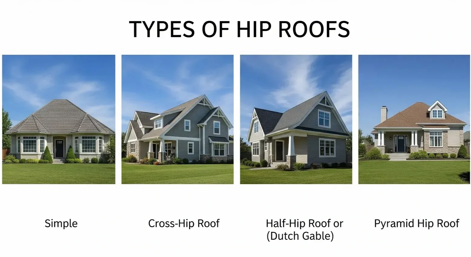 While all hip-style roofs involve four sloping sides, there are a few common variations: